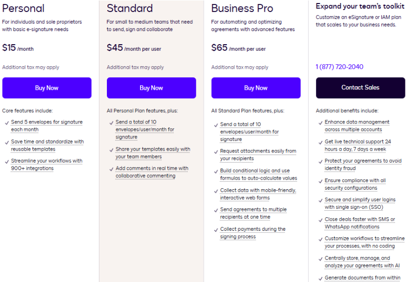 - Enhanced Plans: Customizable for larger teams with added benefits like 24/7 live support, identity fraud protection, single sign-on, AI-powered agreement management, and workflow customization.