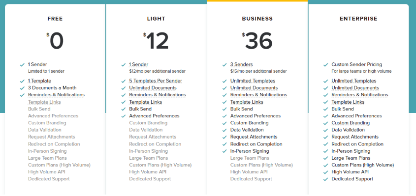 - Business Plan: $36/month for 3 senders, unlimited templates & documents, custom branding, data validation, in-person signing, and more.