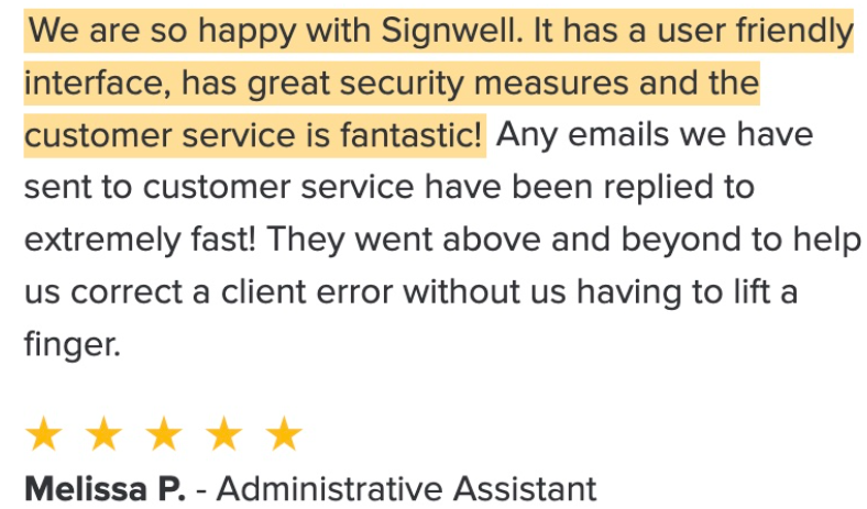 Customer feedback consistently highlights SignWell’s ease of use, with users noting it’s “easier to use and more elegant than DocuSign” and appreciating that “there’s no learning curve for them or their clients.”