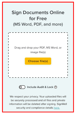 - Once the page loads, you’ll see a marked box prompting you to drag and drop your document, or a yellow button to select your file. No sign-up is required.