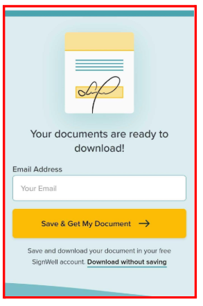 - Enter Your Email: Input your email and click Save & Get My Document to save the signed Word file to your free SignWell account and download it.