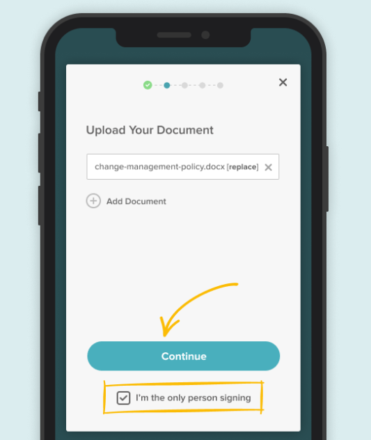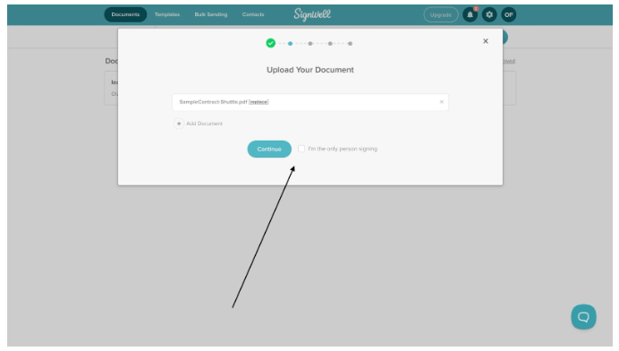 - Once your document uploads successfully, check the “I’m the only person signing” box if you alone need to sign the document; otherwise, click “Continue”.