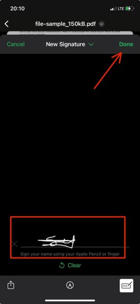 - Once your signature is in place, tap Done or Share to save the signed PDF.