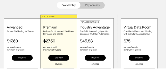 - Premium Plan ($27.50 per user/month): For managing document workflows between teams and clients. This includes unlimited eSignatures, client onboarding, document request lists, and HIPAA/SEC/FINRA eligibility.